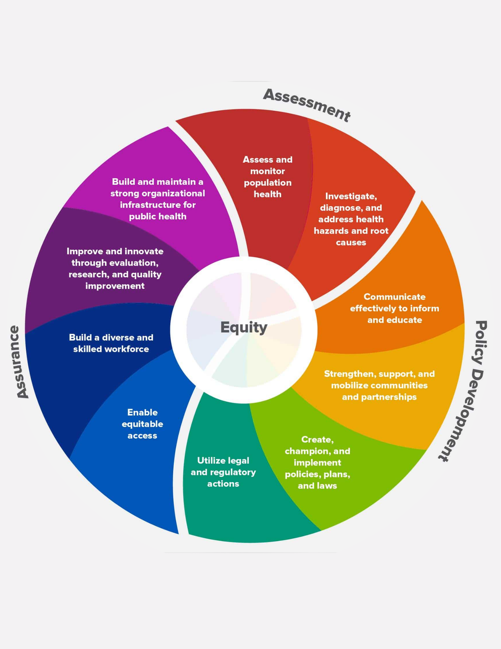 It emphasizes prevention, education, safety, and the conditions that support health, including access to healthcare, safe housing, education, transportation, mental health supports, and emergency preparedness.